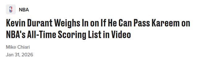 “我从不想把话说死,但那些前辈们把门槛设得太高了,”杜兰特说道,“看看历史得分榜前三名或者前四名的球员就知道,你至少得在联盟征战20个赛季,才能摸到那个门槛的边,而且还得在这15到20年里始终保持顶级水准。所以我更倾向于顺其自然——在联盟里打久一点,打上20多年,再看最终能走到哪一步。如果最后真的能跻身那个行列,自然是好事;就算不能,我也只想一直留在联盟里打球。”