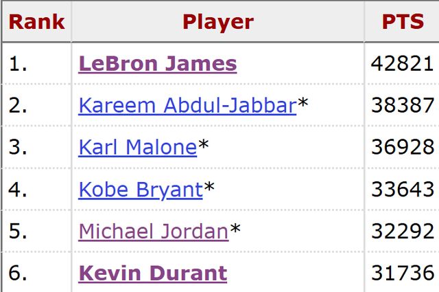 作为15届全明星、4届得分王、2届NBA总冠军、2届总决赛MVP以及1届常规赛MVP,杜兰特目前以31736分的总得分位列历史得分榜第六位,仅次于勒布朗-詹姆斯、阿卜杜尔-贾巴尔、卡尔-马龙、科比-布莱恩特以及迈克尔-乔丹。
