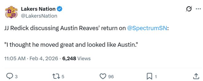 虽然还没有完全找到比赛节奏,但对于攻防体系较为脆弱的湖人来说,能够迎回里夫斯已经是巨大的利好,赛后雷迪克称赞到:“他的移动很棒,看起来很像他自己。”