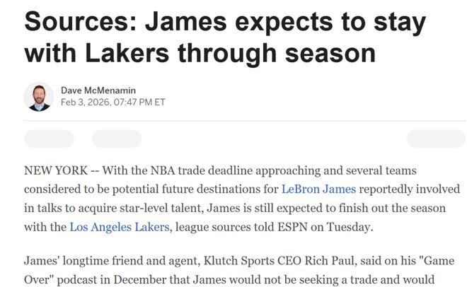 消息来自于ESPN名记Dave McMenamin,他表示数支传言是詹姆斯下家的球队正在进行引进球星的谈判,但詹姆斯预计将在湖人打完本赛季剩余比赛。
